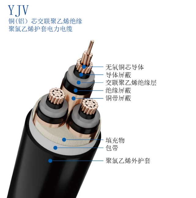 字母含義:YJ:交聯聚乙烯絕緣;V:聚氯乙烯護套;L:鋁導體(銅導體省略)